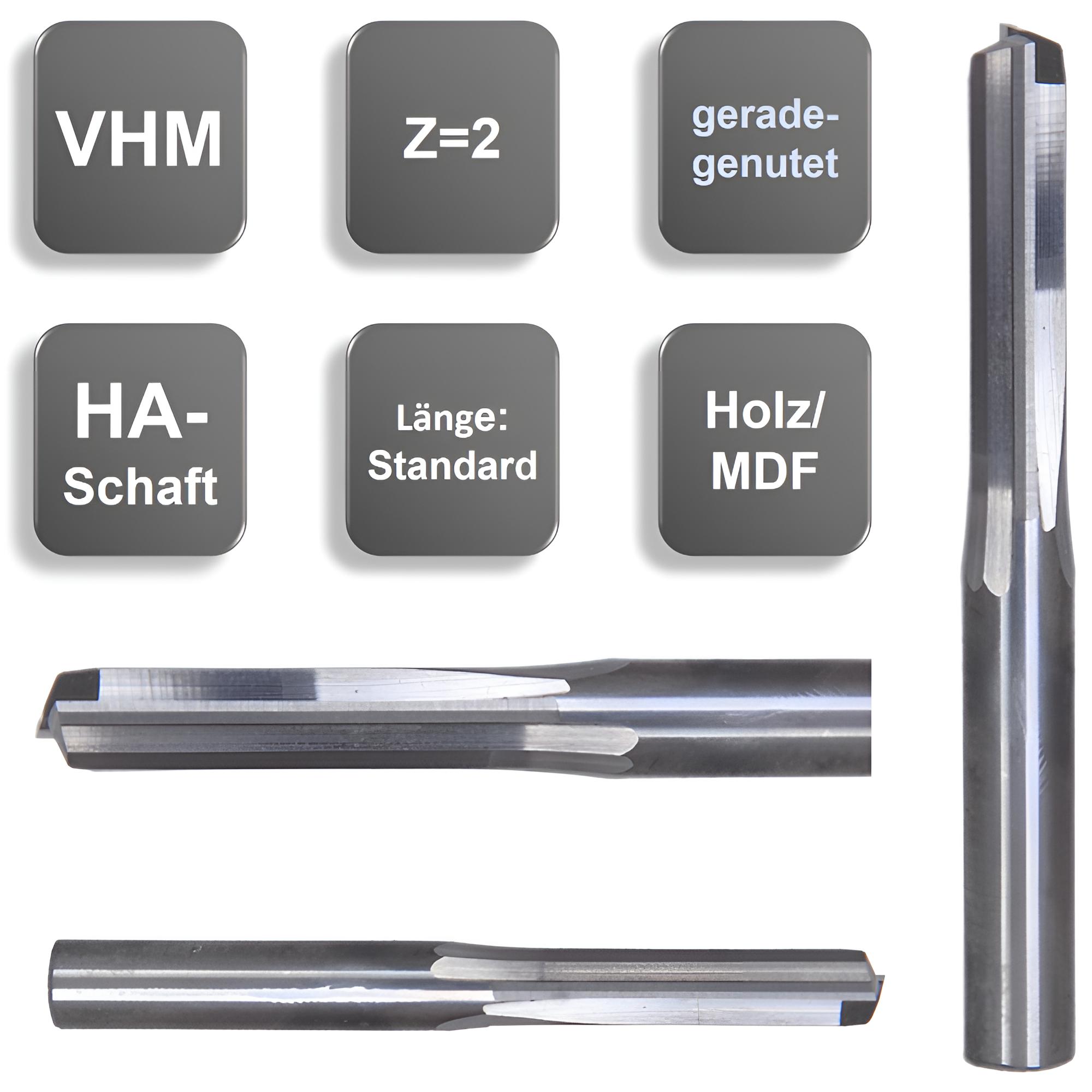 VHM Schaftfräser, Z=2, geradegenuteter Fräser für Holz 3 / 4 / 5 / 6 / 8 / 10 / 12 mm