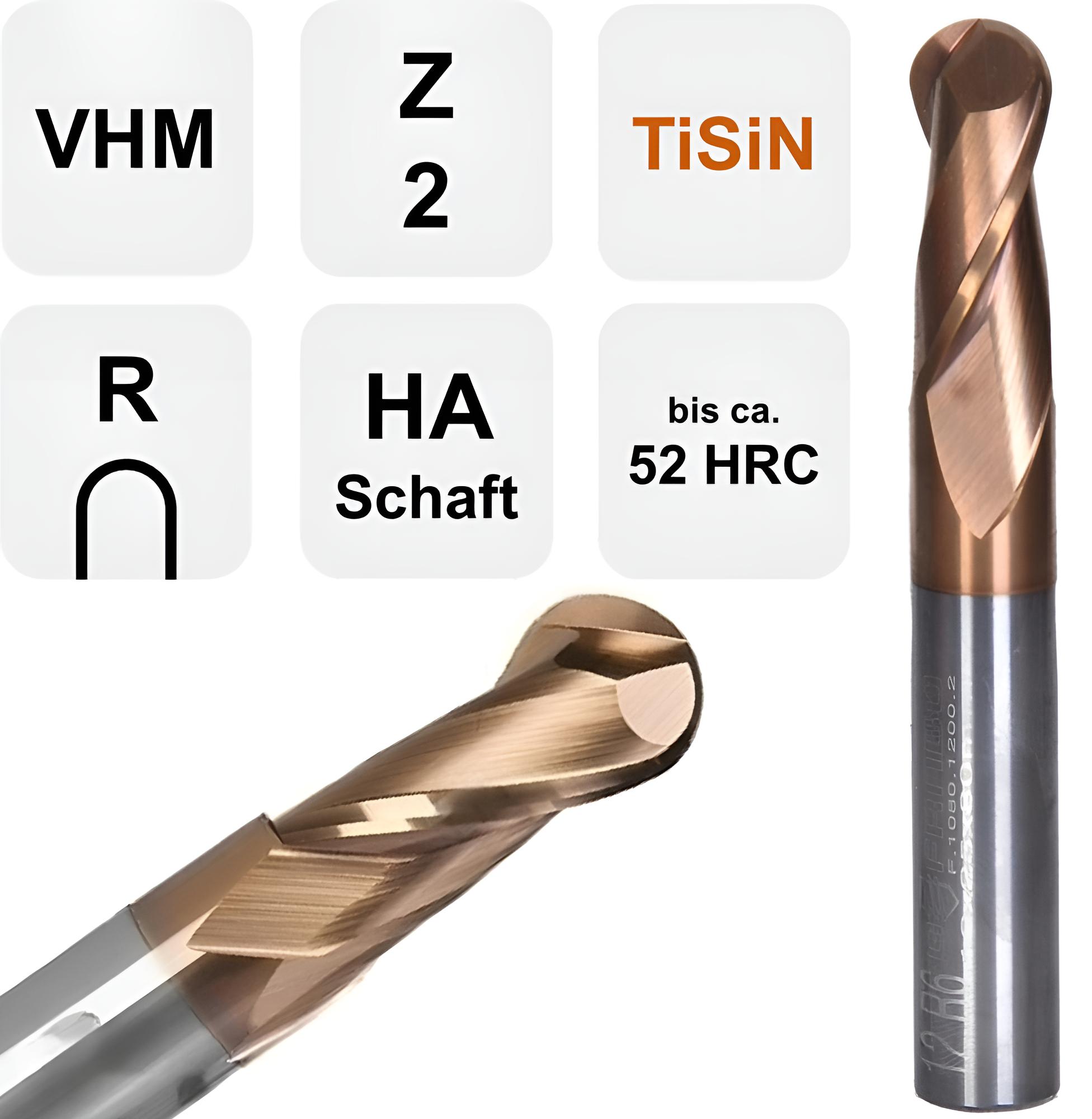 VHM Radiusfräser mit Z=2 bezieht sich auf einen Vollhartmetall-Fräser mit zwei Schneiden. Der Radiusfräser ist speziell für das Fräsen von Radien oder Rundungen in Werkstücken konzipiert.