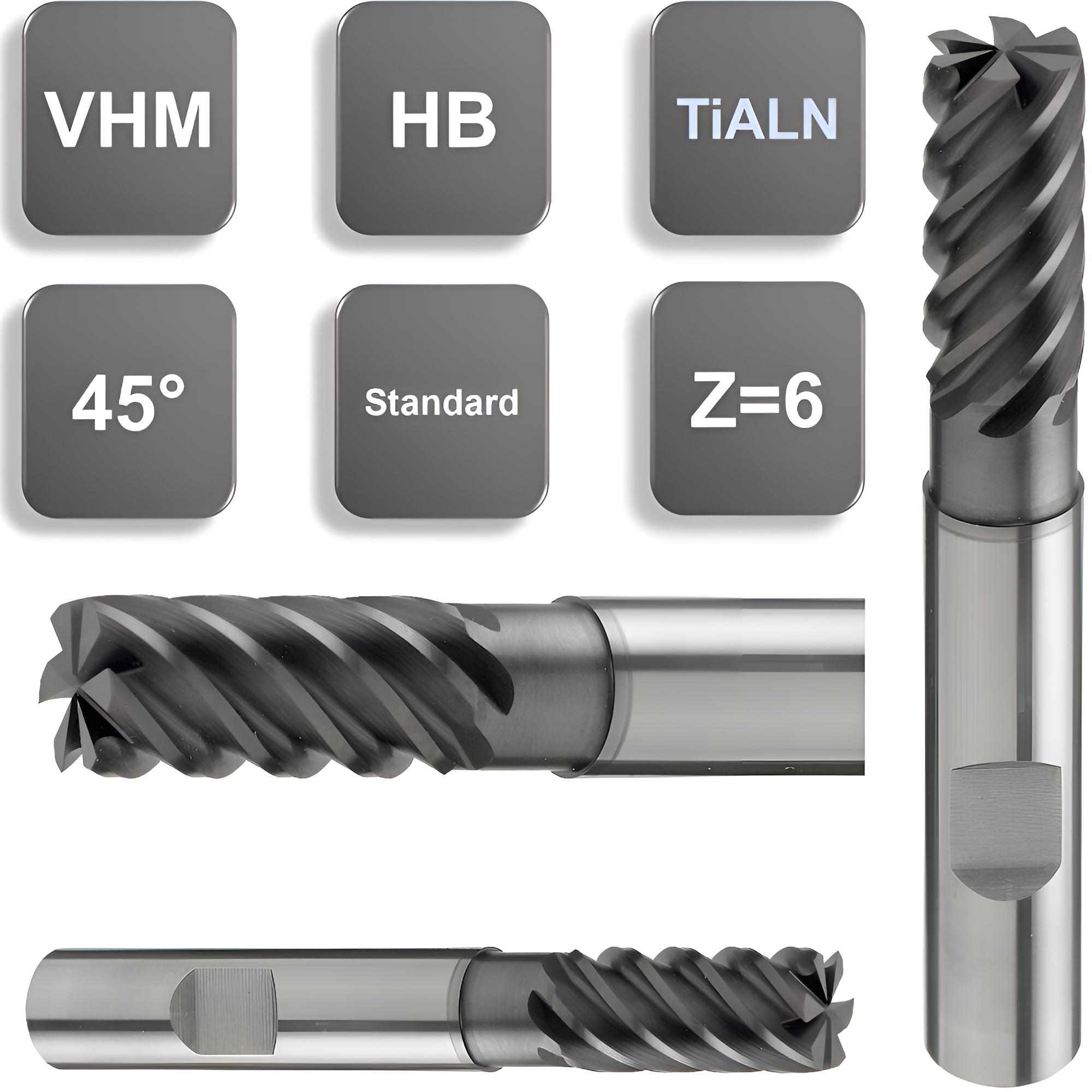 VHM-Schaftfräser 45° Spirale, Universalfräser mit Beschichtung, Z=6, HB-Schaft