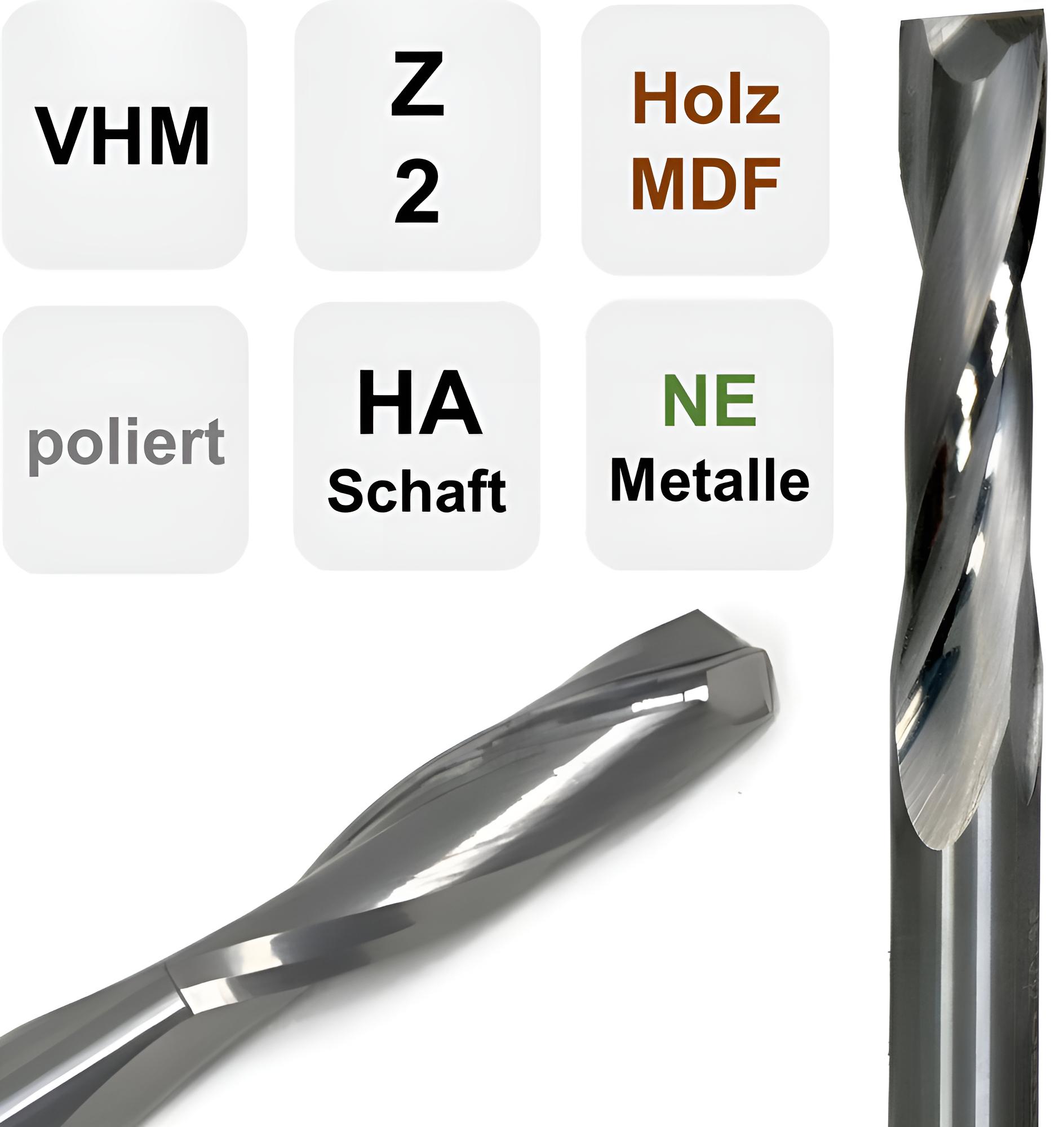 VHM Fräser Z=2 mit scharfen Kanten, geeignet für Holz, MDF und bedingt für Kunststoffe. Ein Fräser mit polierter Spannut ist ein Fräswerkzeug, das speziell für das Fräsen von verschiedenen Materialien entwickelt wurde. Die Spannut ist der Hohlraum zwischen den Schneiden des Fräsers, der die Späne beim Fräsen abführt.Eine polierte Spannut bedeutet, dass die Oberfläche der Spannut des Fräsers poliert ist. Dies hat den Vorteil, dass die Späne besser abgeführt werden können und sich weniger in der Spannut verfangen. Dadurch wird eine bessere Spanabfuhr gewährleistet und das Risiko von Verklemmungen oder Überhitzung des Werkzeugs reduziert.
