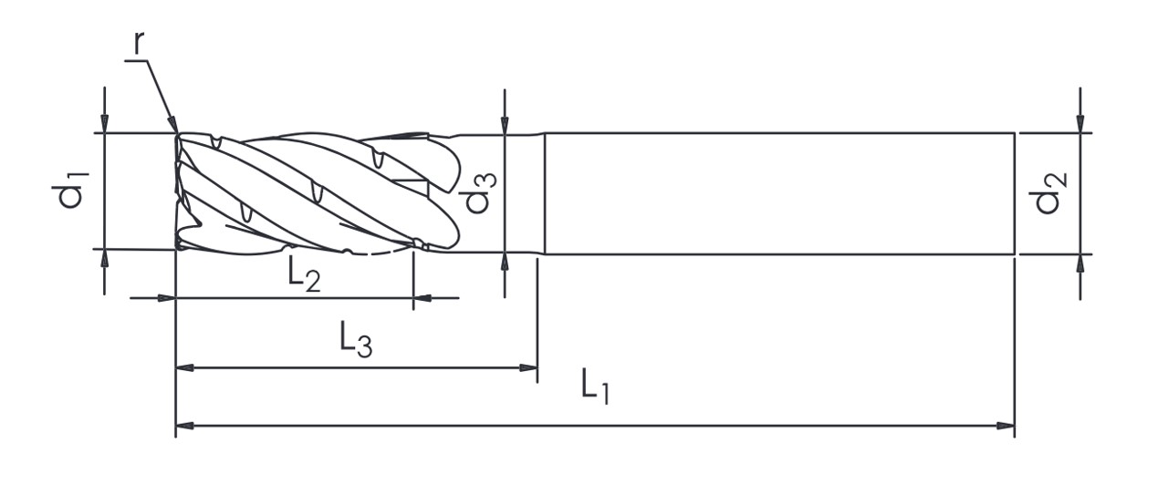 Startseite » 6,0 R0,5 x 13 x 18 x 57 - d2=6 mm ✓ VHM TPC Fräser, Trochoidalfräser, 33/35°, Z=5, ProCoat mit Spanbrecherform