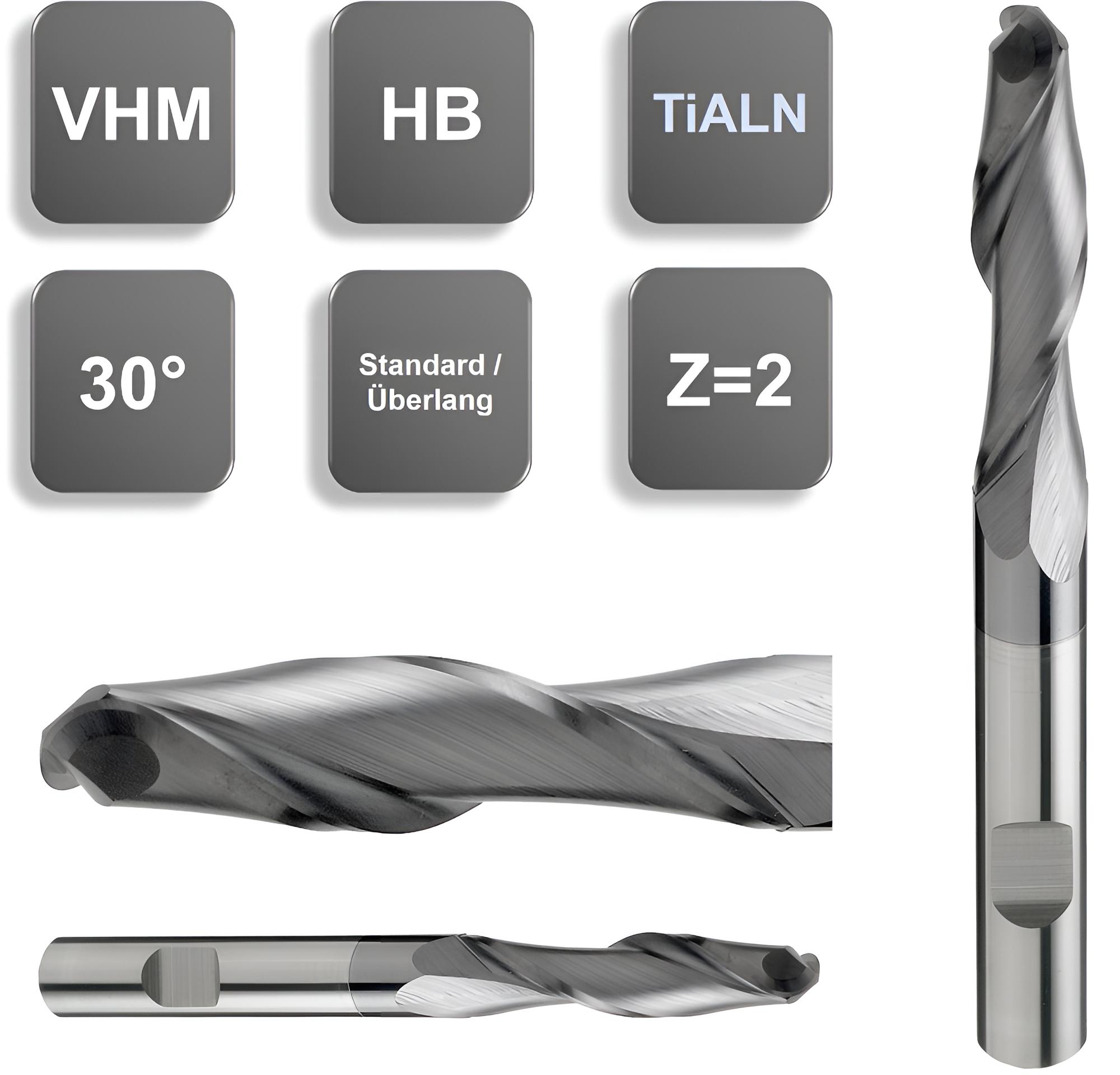 VHM-Radiusfräser 30°, Z=2, Vollradiusfräser Spezialbeschichtet, Überlang