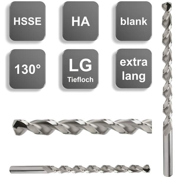 Ein HSSE-Spiralbohrer überlang 130° ist ein Hochleistungs-Spiralbohrer aus Schnellarbeitsstahl mit einem Spitzenwinkel von 130 Grad.
