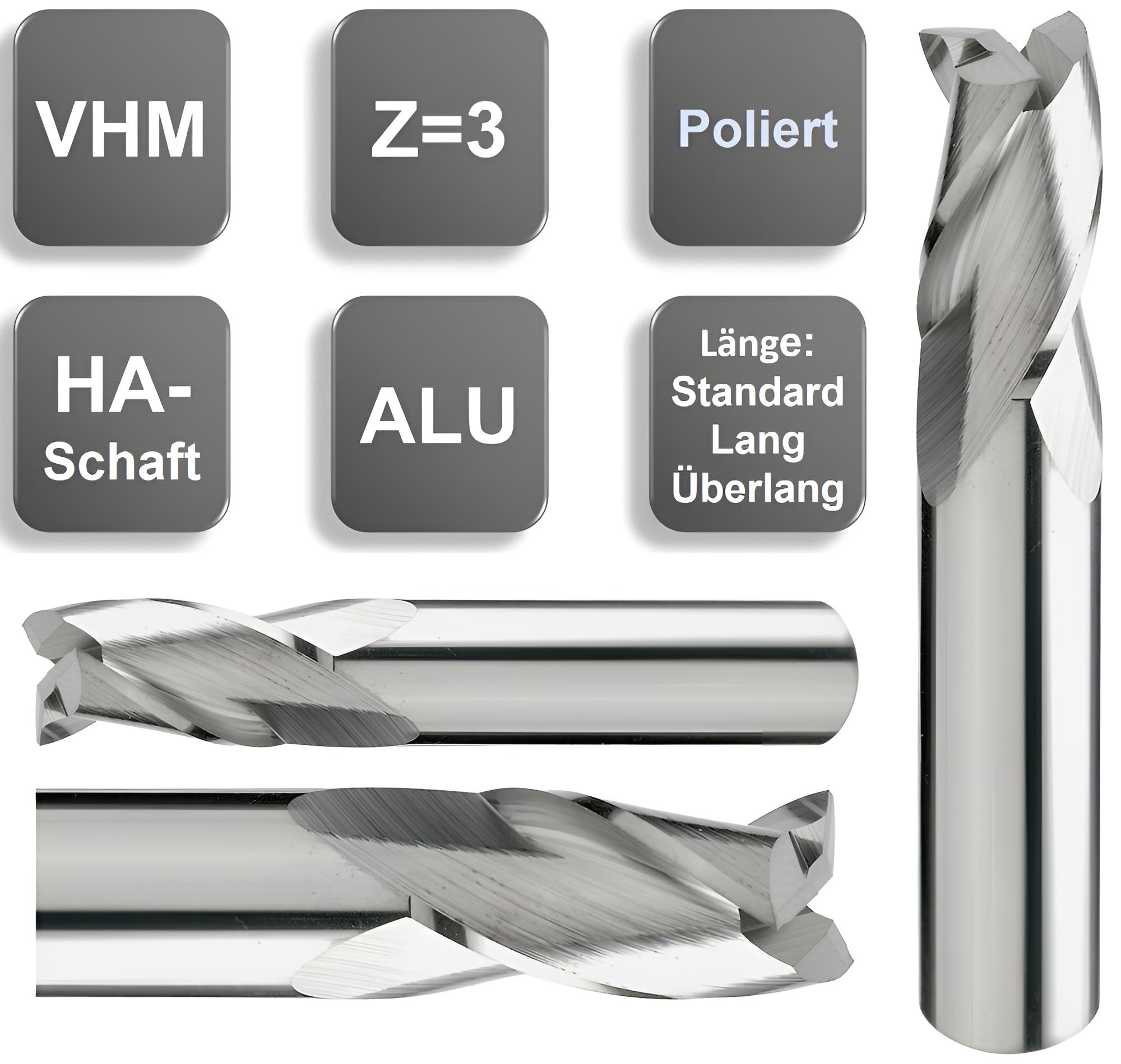 Universalfräser, Schaftfräser, Alu-Fräser bzw. Fräser Z=3 aus feinstem VHM (Vollhartmetall) - 100% Made in Germany