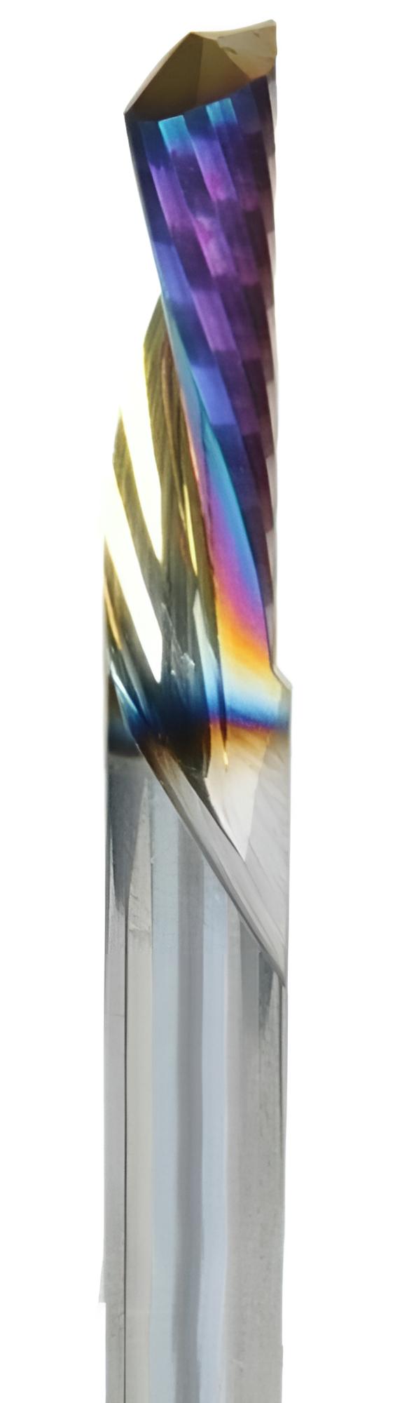 VHM Einzahnfräser, mit polierter Spannut & RainBow Beschichtung rechtsschneidend mit linksspirale - downcut - sehr gut geeignet für Acyrl, Plexiglas, Holz und Aluminium