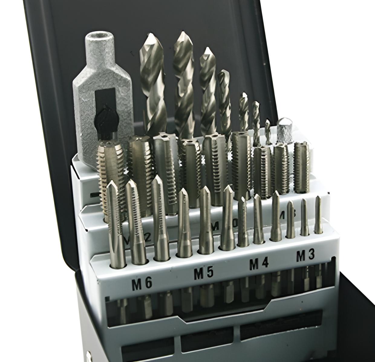Gewindebohrer 29 teilig Set M3 - M12 Handgewindebohrer als Satz und Kernlochbohrer Gewinde