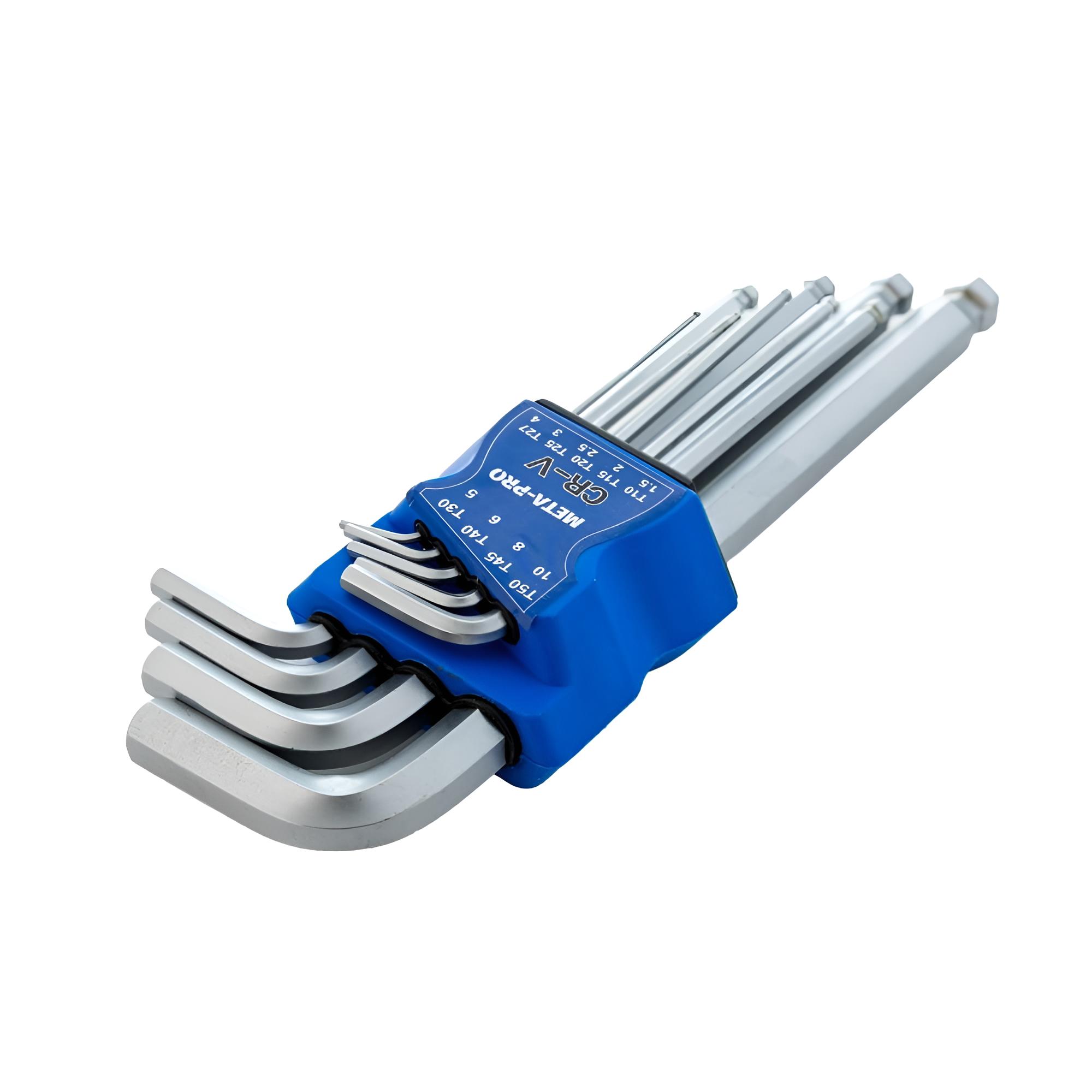Der 9-teilige Imbus-Schlüsselsatz HEX mit Kugel von META-PRO ist ein hochwertiges Profi-Werkzeugset für präzise Schraubarbeiten. Dank langer Ausführung und Kugelkopf eignet sich das Set ideal für schwer zugängliche Schrauben und anspruchsvolle Montagearbeiten.