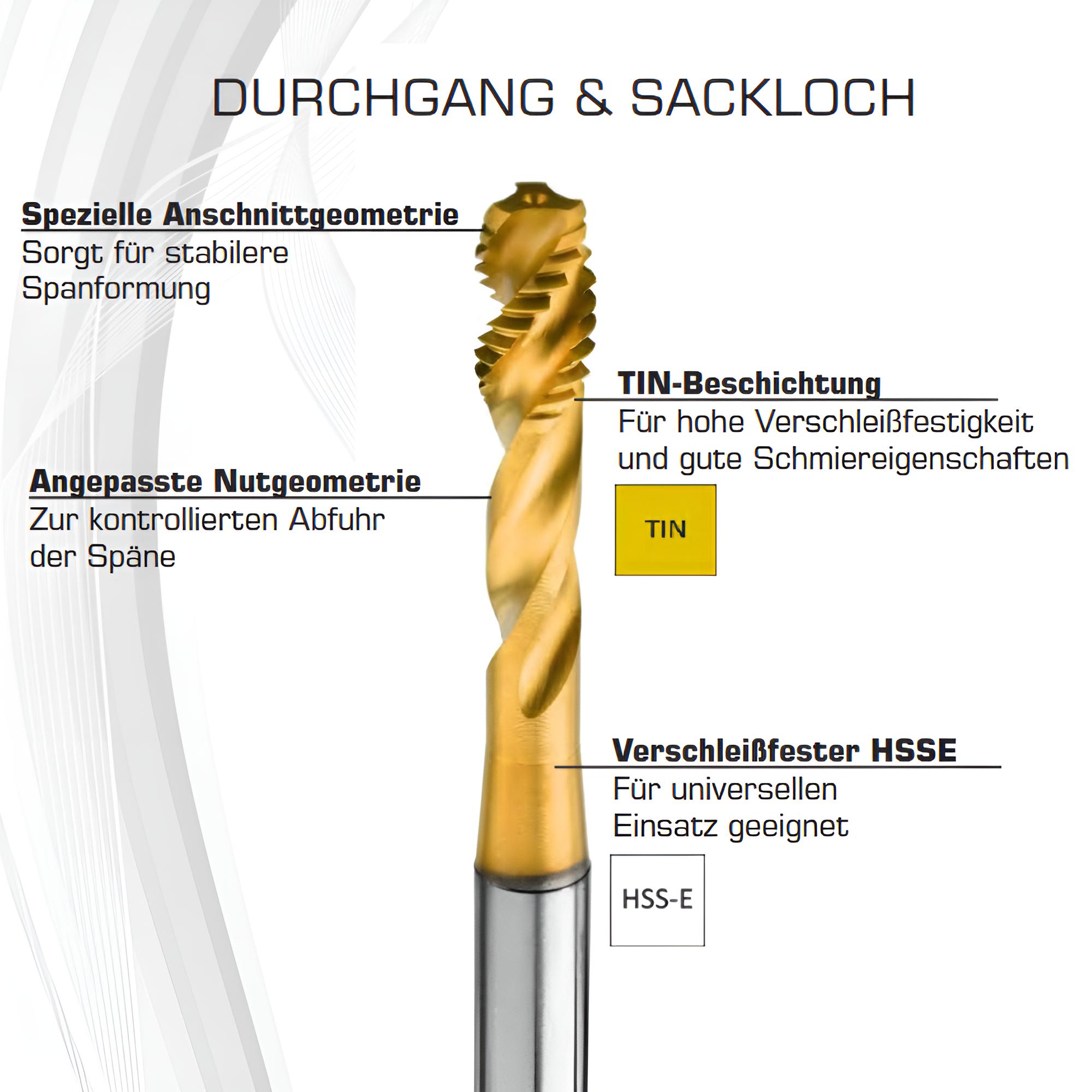Die Titannitrid (TiN) Beschichtung reduziert Reibung und verbessert die Schmierung während des Schneidprozesses. Dadurch wird nicht nur die Standzeit verlängert, sondern auch die Oberflächenqualität des Gewindes optimiert.